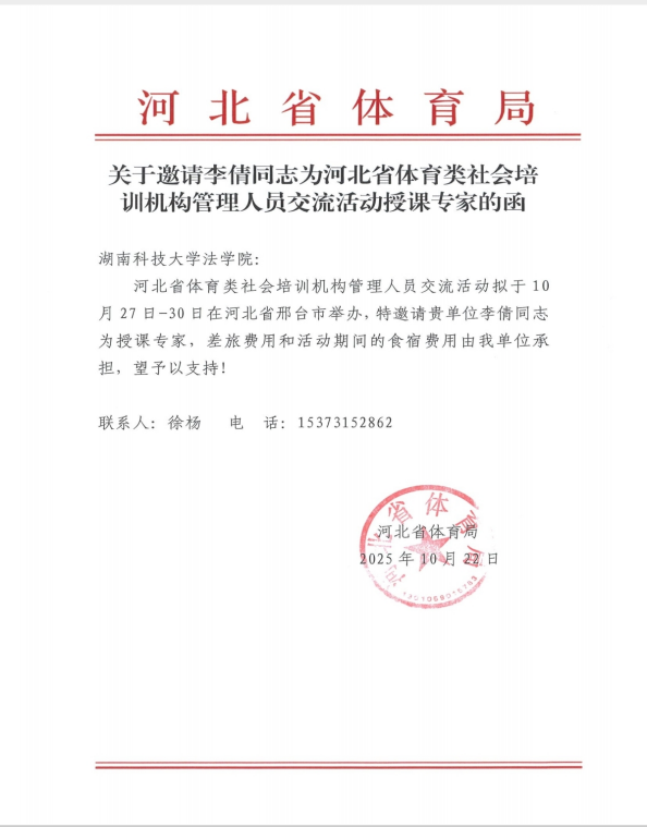 李倩副教授受国家体育总局和山东、河北省体育局邀请,分别于2025年5月、10月和11月开展“青少年体育俱乐部主要法律风险及其防范”系列讲座。