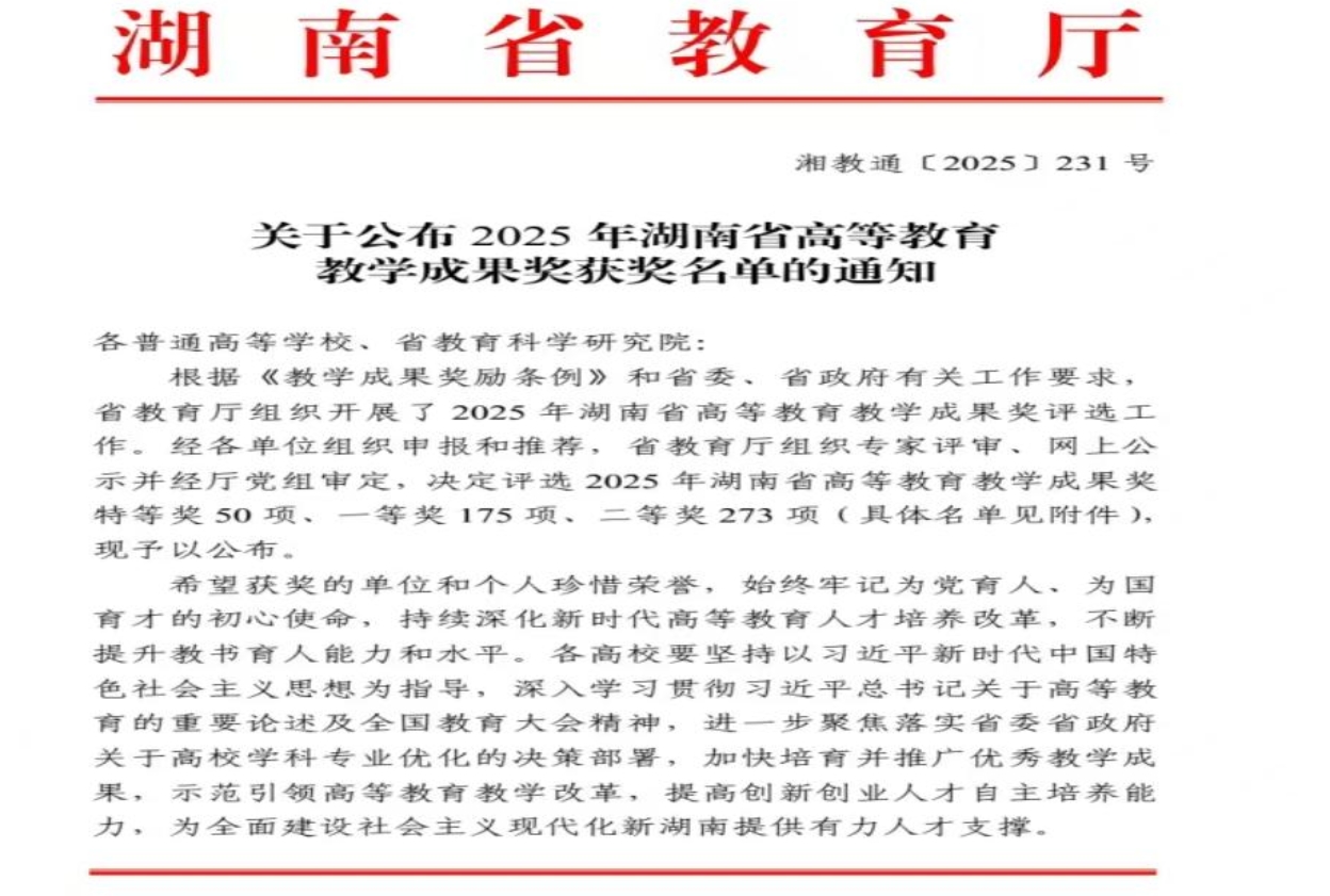 近日,湖南省教育厅正式公布2025年全省高等教育教学成果奖获奖名单,明陞m88官网